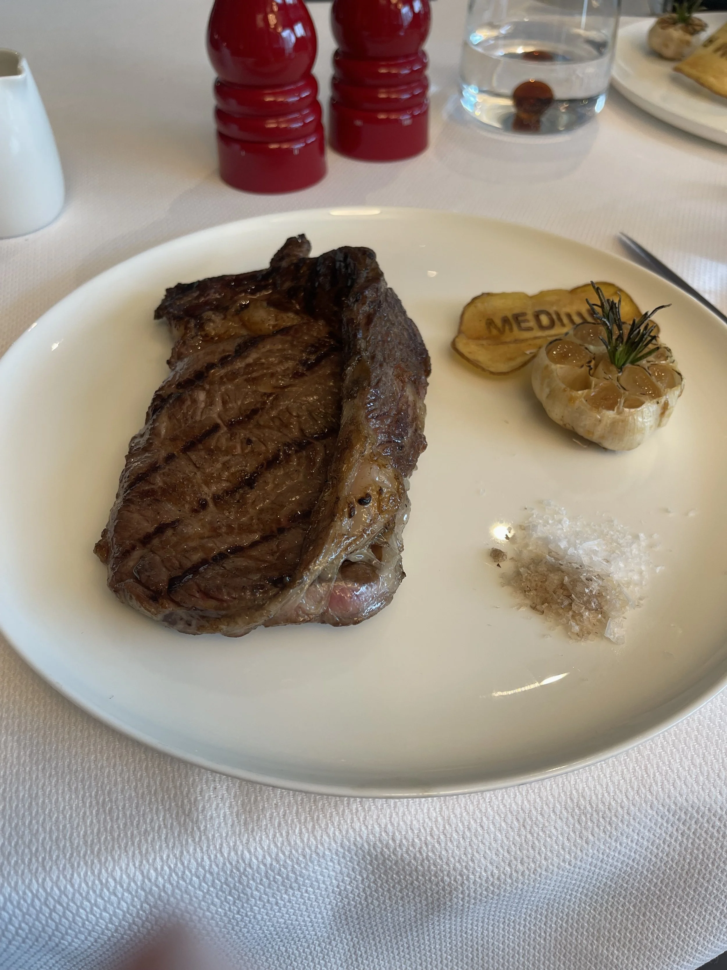 When you sit on your table, the waiter takes the order for your main. They had 2 options of steak and pasta. We obviously went for the steak: tenderloin and ribeye, both medium rare cooked perfectly.